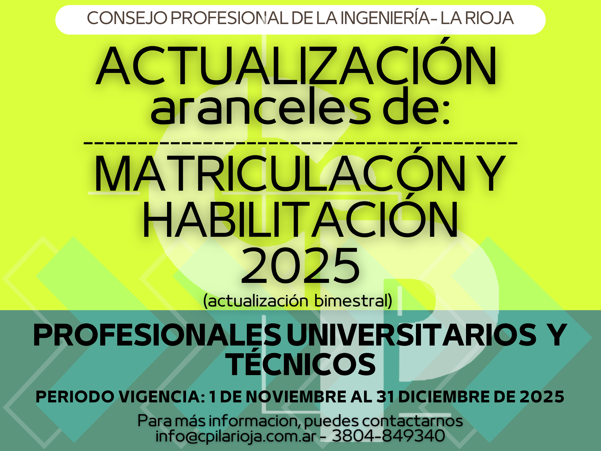 Informamos a nuestros Matriculados, sobre la actualización de los valores de aranceles de habilitación de su matrícula para el periodo 2025. Ingresa a la publicación e infórmate de las novedades. (vigencia 01/09/25 al 31/10/2025)