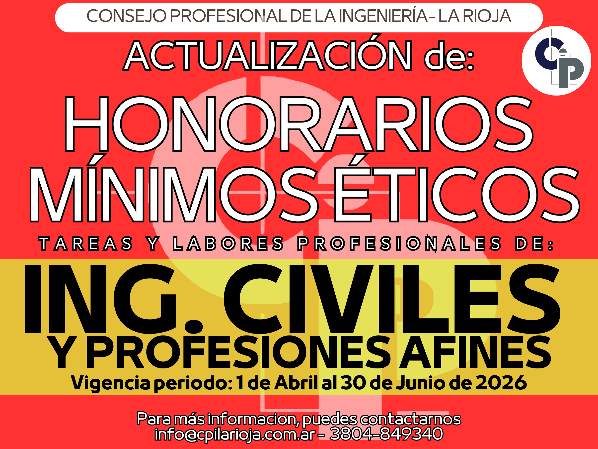 Valores de los Honorarios mínimos éticos indicativos para las tareas y trabajos relacionadas con las Profesiones de Ingeniería Civil y Profesiones afines. Vigencia periodo 1 de Abril al 30 de Junio de 2026.