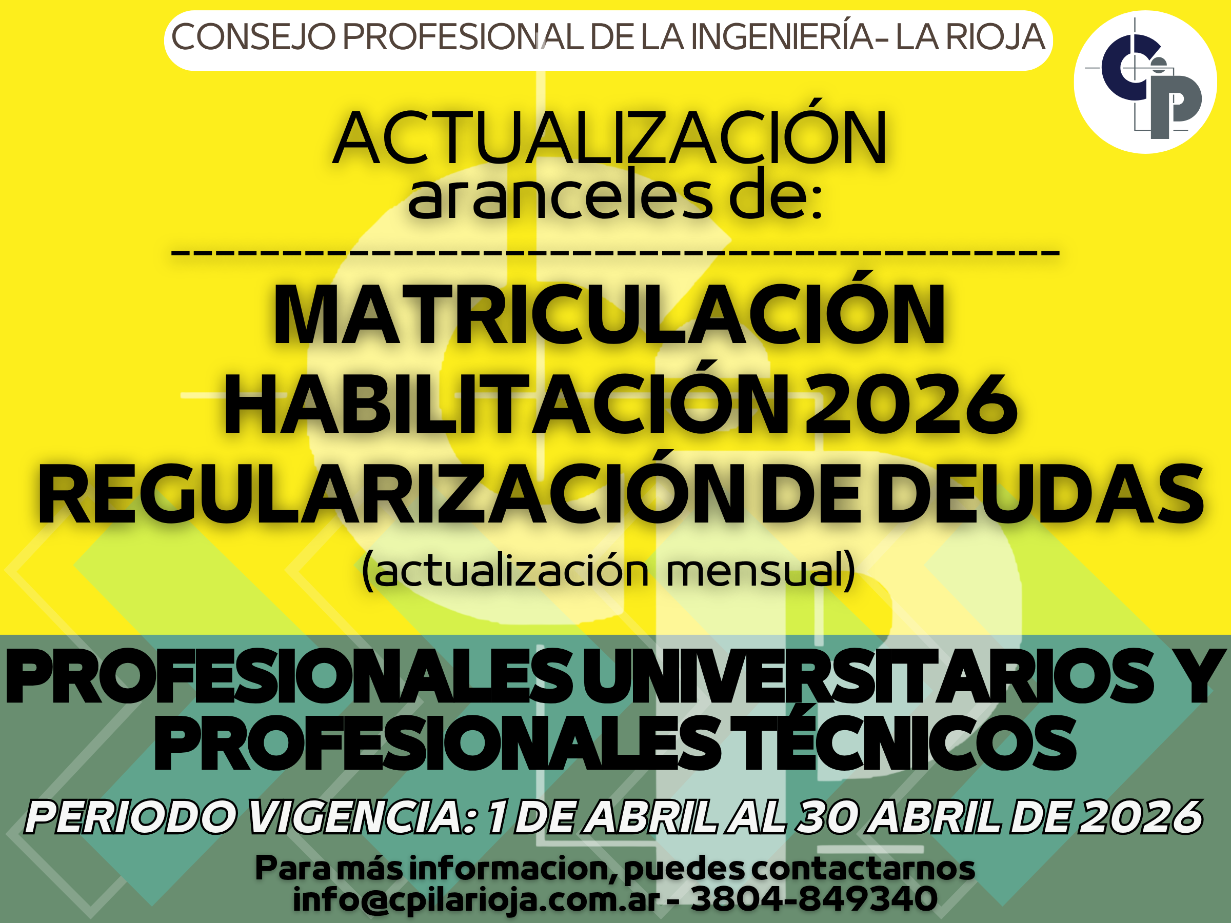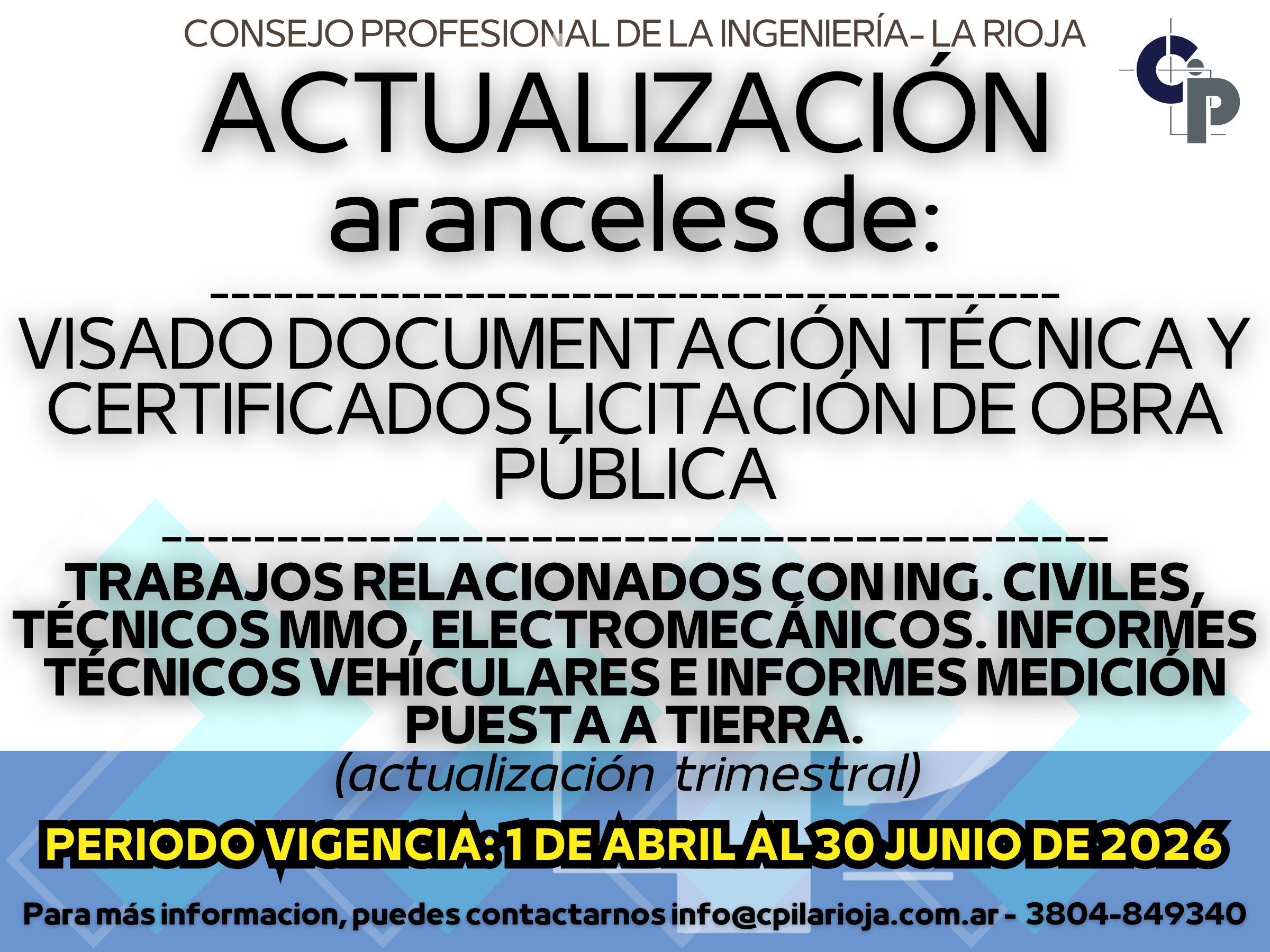 Informamos a nuestros Matriculados, los nuevos valores de aranceles de visado de documentación técnica (Obras de Arq. Ingeniería Civil, informes Técnicos Vehiculares e informes Puesta a tierra) y Aranceles de Certificados de Licitación de obras públicas. Ingresa a la publicación e infórmate de las novedades. Vigencia 2do Trimestre 2026.
