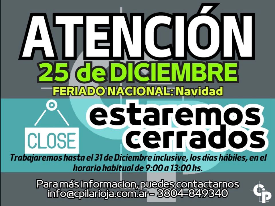 Estaremos trabajando todo el mes de diciembre 2025, salvo el día jueves 25 por feriado nacional.