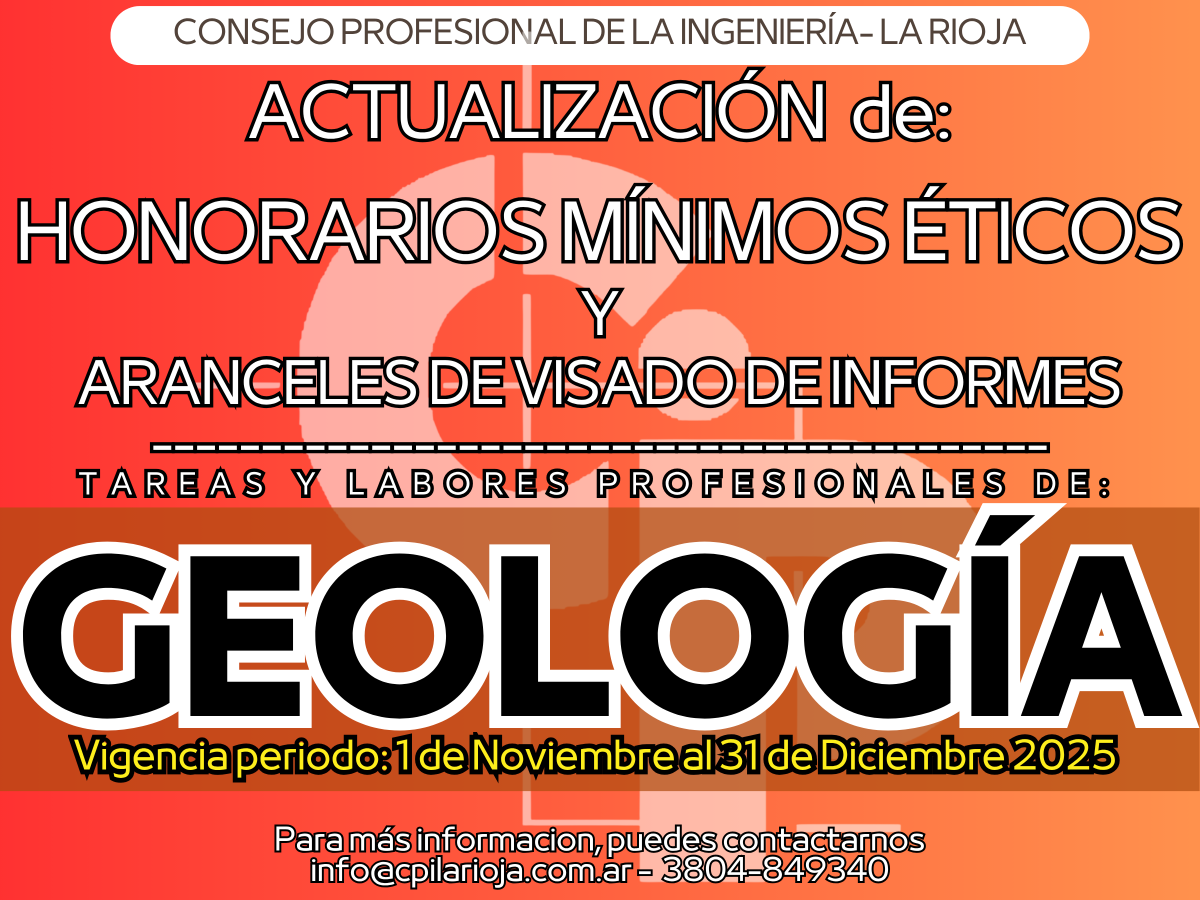 Valores de los Honorarios mínimos éticos indicativos y aranceles de visado de informes técnicos para las tareas y trabajos relacionadas con las Profesiones de Geología y Profesiones afines. Vigencia del 01/11/2025 al 31/12/2025